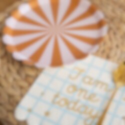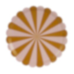 6 prachtig gevormde bordjes met bruine en roze strepen. De bordjes zijn gemaakt van karton en hebben een diameter van 21 cm.