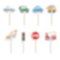 8 caketoppers met verschillende kleurrijke voertuigen, verkeerslichten en verkeersborden. Perfect om taarten en gebak te versieren voor een kinderfeestje met een voertuigthema! Ze zijn ongeveer 9 cm hoog en gemaakt van papier en hout.