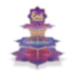 Maak van je desserttafel een feestelijk hoogtepunt met deze prachtige Eid Mubarak cupcake standaard! Met zijn elegante ontwerp in blauw, paars en goud is het de perfecte manier om cupcakes, koekjes of andere lekkernijen te presenteren tijdens de viering. Het meerlaagse design zorgt voor een luxe uitstraling en creëert een sfeervolle decoratie voor je Eid-feest.