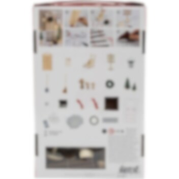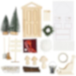 Inhoud: Deur, brievenbus, slee, verkeersbord, emmer, schep, bezem, paddenstoelen, kerstbomen, krans, LED-lichtslingers, kunstsneeuw, deken, garenpompom, houtsnippers, touw, lint, sjablonen, tape en zelfklevende stippen. De LED-lichtslinger wordt aangedreven door 2 st. AA-batterijen niet inbegrepen.