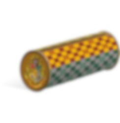 Het etui heeft een ruitpatroon in de kleuren van Gryffindor en Slytherin met het gouden Hogwarts-embleem aan de zijkanten. De ronde vorm maakt het ruim en praktisch, ideaal voor pennen, potloden en kleine magische spulletjes.