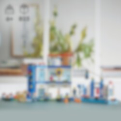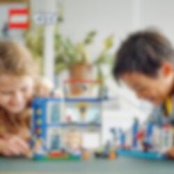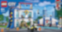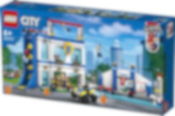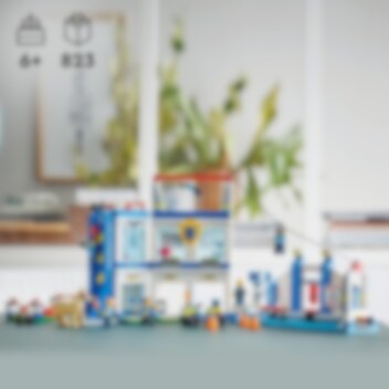 Welkom bij de LEGO® City Politietraining academie! Deze plek zit vol met geweldige uitdagingen voor nieuwe rekruten. Klauter op de klimmuur, slinger aan het klimrek en zoef naar beneden met de tokkelbaan. Bewaar je evenwicht om de geweldige hindernisbaan te voltooien. Race rond de kegels om te slagen voor de rijtest. Zadel dan je paard op en ga voor de hoge sprong. Goed gedaan, nieuweling!