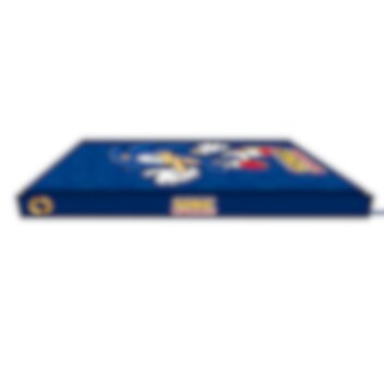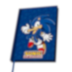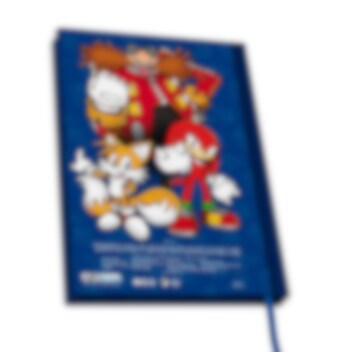 Chique notitieboek in blauwe kleur met afbeeldingen van Sonic op de voorkant en Tails, Knuckles en Doctor Robotnik op de achterkant, allemaal uit de iconische gameserie Sonic the Hedgehog van SEGA.