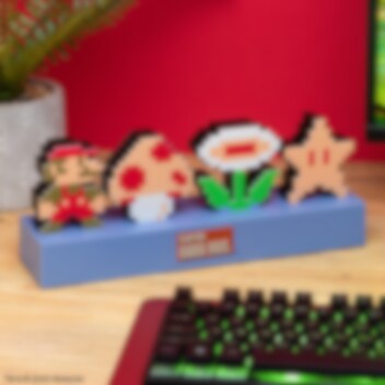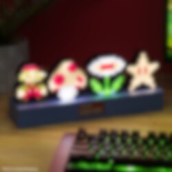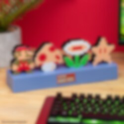 Coole lamp met afbeeldingen van Super Mario, de Rode Paddenstoel, de Vuurbloem en de Superster, in retrostijl geïnspireerd op de klassieke Super Mario Bros-games van Nintendo. Perfect als decoratie in het huis van elke Super Mario-fan.