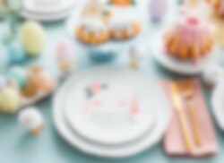 20 servetten in de vorm van een super schattig konijntje met details van roze en goudfolie en met een bloem aan één kant van het hoofd. Decoratief om voor de paasviering op tafel te hebben staan.
