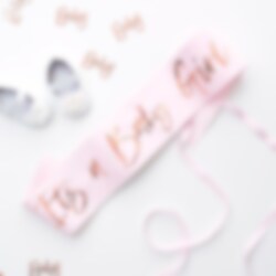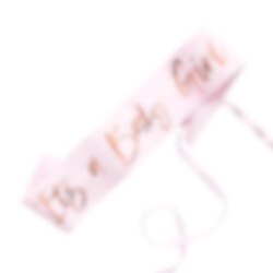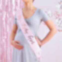Heerlijk mooie roze sjerp om te dragen door de aanstaande moeder bij de babyshower! De sjerp is lichtroze met prachtige tekst in roségoud. De sjerp is 75 cm (van schouder tot heup) en 10 cm breed.