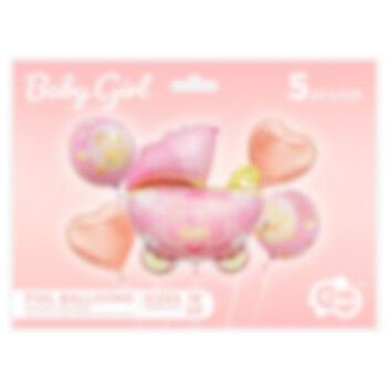Heerlijk ballonboeket met verschillende folieballonnen in een roze babyshower thema. Het boeket bestaat uit een grote ballon in de vorm van een kinderwagen met de tekst Baby Girl, 55 cm, twee ronde ballonnen met de tekst It's a girl, 35 cm en twee hartvormige ballonnen in roségoud, 35 cm. Naast de ballonnen wordt er een wit ballonlint meegeleverd.