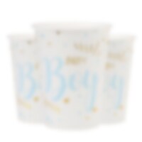 10 schattige bordjes met de tekst Baby Boy en met fijne details in de kleuren lichtblauw en goud. De randen zijn ook goud verijdeld. Leuk om neer te zetten als het een babyshower of doopfeestje wordt en mooi om te decoreren samen met de bijbehorende bekers, servetten en tafelloper in hetzelfde thema.