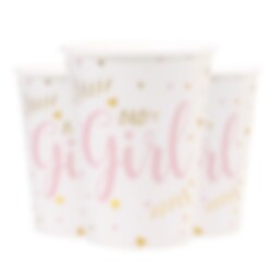 10 stuks papieren bekers in wit met de tekst Baby Girl en met motieven van fijne details in de kleur roze en goudfolie. Een mooie accessoire om te hebben en neer te zetten voor de babyshower of doop. Leuk te matchen met onze andere accessoires van hetzelfde thema.