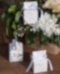 De doosjes zijn ongeveer 4 x 4 x 4 cm en worden geleverd met roze satijnen lint.