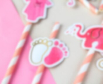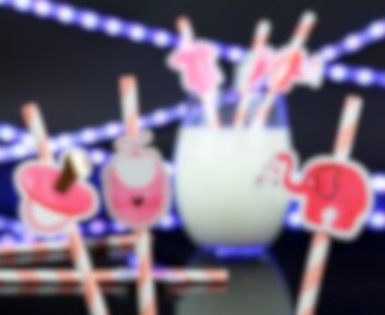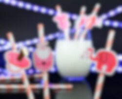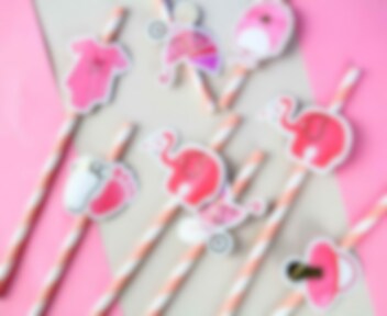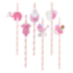 8 kartonnen rietjes in zoet roze babyshower thema. De rietjes zijn ongeveer 20 cm lang en zijn versierd met fopspenen, babyvoetjes, olifanten, kinderwagens en babykleertjes.