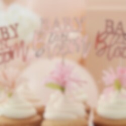 12 schattige muffindecoraties met motieven van de woorden "Baby in Bloom" in roségoudfolie en kwastjes in de kleuren lichtroze en perzik aan de onderkant van de stokjes. Versier je baksels hiermee om ze extra leuk te maken voor de babyshower. De decoraties zijn ongeveer 12 cm hoog.