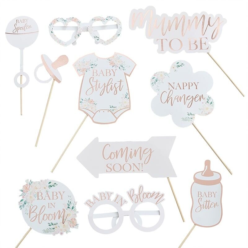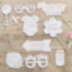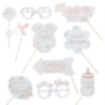 10 stuks diverse leuke foto rekwisieten in mooie kleuren met babymotieven uit de "Baby in Bloom" collectie. Perfect om mee te nemen naar de Babyshower om onvergetelijke kaarten mee te nemen met de gasten.