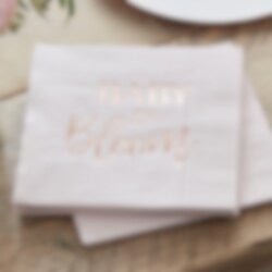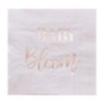16 servetten in een lichtroze kleur met motief van de tekst "Baby in Bloom" roségoudfolie aan één zijde. Een leuke tafelaankleding voor de babyshower. De servetten hebben 2 lagen en zijn uitgevouwen 33 x 33 cm.