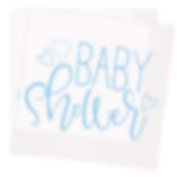 16 witte servetten met aan een zijde de blauwe tekst "Babyshower". De servetten hebben 2 lagen en zijn uitgevouwen 33 x 33 cm.