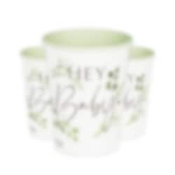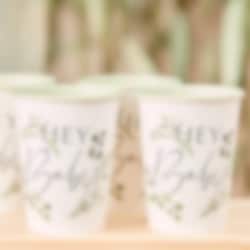 8 witte en groene papieren bekers met motieven van bladeren en de tekst "Hey Baby". Neem deze op in de tafelaankleding voor de babyshower of doop. De bekers zijn ongeveer 10 cm hoog en hebben een inhoud van ongeveer 250 ml.