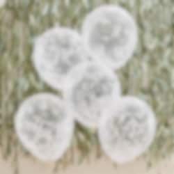 5 stuks ballonnen gevuld met witte confetti en met de tekst "Hey Baby" aan de buitenkant. Een leuke decoratie voor je babyshower. De ballonnen hebben een diameter van ongeveer 25 cm wanneer ze zijn opgeblazen.