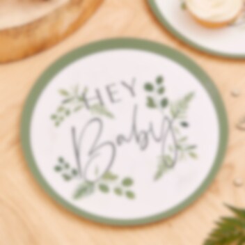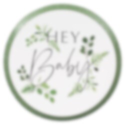 8 groen-witte papieren bordjes uit het Botanical Baby thema met motieven van takjes en bladeren en de tekst "Hey Baby" in een donkergrijze kleur. Perfect om op te nemen in de tafelaankleding voor de babyshower of doop. De bordjes zijn milieuvriendelijk en hebben een diameter van ongeveer 24 cm.