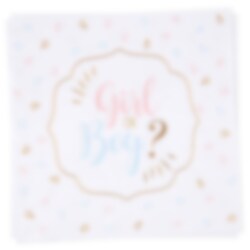 20 schattige servetten met stijlvolle details in de kleuren blauw, roze en goudfolie en de tekst "Girl or Boy?" middenin. Perfect voor het gender reveal feest. De servetten zijn 16,5 x 16,5 cm.