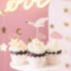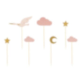 7 cake toppers met motieven van ooievaars tussen wolken, sterren en een maansikkel in roze en gouden kleuren. Ze zijn tussen de 11 en 13,5 cm hoog.