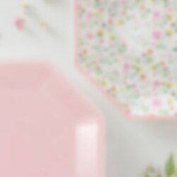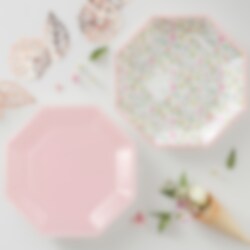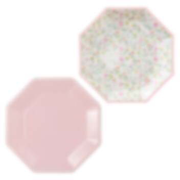 8 papieren bordjes in 2 verschillende ontwerpen: 4 bordjes in lichtroze en 4 bordjes met afbeeldingen van bloemen. De bordjes hebben een diameter van ongeveer 23 cm.