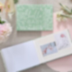 Elk fotoalbum is gemaakt van bloemenlinnen met de woorden "Hello Baby" op de voorkant. Het heeft 24 pagina's met een mix van zelfklevende fotopagina's voor 12,5 x 17,5 cm foto's en lege pagina's om op te schrijven.