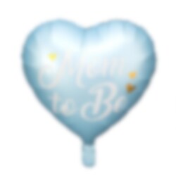 Mooie blauwe hartvormige folieballon met de tekst "Mom to Be" in witte en goudkleurige hartjes. Een leuk detail om mee te nemen naar je babyshower.