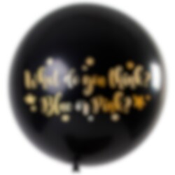 Grote zwarte ballon met motief van de tekst "What do you think? Blue or Pink?" in goud en bevat ook blauwe confetti. Een stoere decoratie om tijdens de gender reveal party met een speld te knallen om het geslacht van het kind te onthullen. De ballonnen hebben een opgeblazen diameter van ongeveer 90 cm en kunnen worden opgeblazen met helium en gewone lucht.