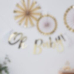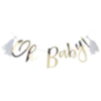 Leuke slinger in goudfolie met de tekst Oh Baby en twee witte kwastjes. Een decoratief ding om mee te nemen naar de babyshower. De slinger is ongeveer 150 cm lang.