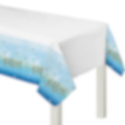 Prachtig plastic tafelkleed in blauw kleuren met elementen van wit en goud en met motieven van de tekst "Oh Baby!" en harten en sterren. Een echt indrukwekkend accessoire voor de babyshower. Het tafelkleed heeft een afmeting van 137 x 259 cm.