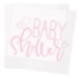 16 witte servetten met aan een kant de tekst "Babyshower" in roze. De servetten hebben 2 lagen en zijn uitgevouwen 33 x 33 cm.
