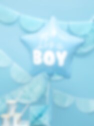 Hele mooie blauwe stervormige folieballon met de tekst "It's a boy" in het wit. Een mooie ballon die de babyshower decoratiefer zal maken. De ballon heeft een diameter van ongeveer 45 cm.