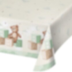 Leuk papieren tafelkleed met motieven van een schattige teddybeer en babyblokken. Het tafelkleed is 137 x 259 cm.