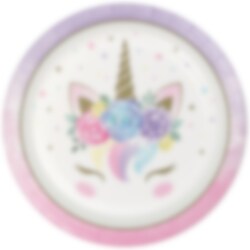 8 papieren bordjes met pastelroze/paarse randen, een witte achtergrond en afbeeldingen van een kleurrijke eenhoorn en sterren. De bordjes hebben een doorsnede van ongeveer 22 cm.