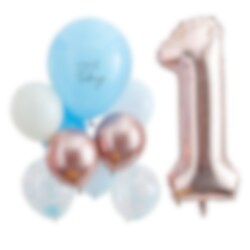Stijlvol ballonboeket in blauw en roségoud kleur met een 1 jaar thema. Versier de kamer hiermee voor het 1-jarig verjaardagsfeestje om het extra feestelijk te maken. Het pakket bevat: