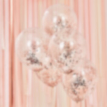 5 stuks mooie transparante ballonnen gevuld met glinsterende roségouden confetti. De ballonnen kunnen worden opgeblazen met lucht of met helium en hebben een diameter van ongeveer 30 cm wanneer ze volledig zijn opgeblazen.