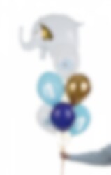 De verpakking bevat 2 stuks lichtblauwe ballonnen met een motief van witte, 2 witte ballonnen met motieven van lichtblauwe olifanten, 1 goudfolieballon en 1 donkerblauwe ballon.