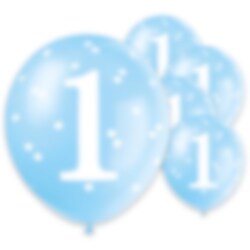 5 lichtblauwe latex ballonnen met motief van het cijfer 1 en vierkanten in witte kleur. Perfect om de kamer mee te versieren voor het 1-jarig verjaardagsfeestje. De ballonnen worden opgeblazen tot een diameter van ongeveer 30 cm en opgeblazen met lucht of helium.