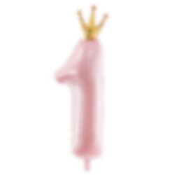 Supermooie folieballon in lichtroze die het cijfer 1 voorstelt. De ballon heeft ook een gouden kroon bovenop en is een prachtige decoratie voor een 1e verjaardag.