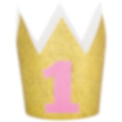 Feesthoedje van een kroon in gouden glitter en met motief van het cijfer 1 in roze. Dit fijne kroontje kan door de jarige gedragen worden tijdens het 1-jarig verjaardagsfeestje. De kroon is ongeveer 10 cm hoog en wordt op zijn plaats gezet met behulp van een elastische band.
