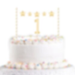 Taartdecoratie in goudkleur waarmee je de taart kunt versieren voor het 1 jaar verjaardagsfeestje. Het pakket bevat 2 stuks goud met wit gestreepte kartonnen rietjes, een slinger met goudfolie sterren en een goudfolie ster.