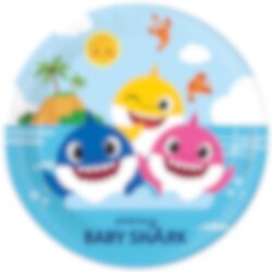 8 papieren bordjes in een blauwe kleur en met afbeeldingen van de vrolijke en grappige haaienfamilie uit Pingfong's populaire kinderliedje Baby Shark. Perfect om op tafel te zetten als er een Baby Shark kinderfeestje is. De bordjes hebben een diameter van ongeveer 23 cm.