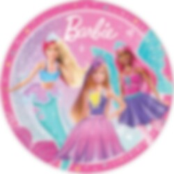 8 bordjes met kleurrijke afbeeldingen van Barbie. De borden zijn gemaakt van milieuvriendelijk papier en hebben een diameter van 23 cm.