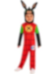Verkleed je kleintje als het geliefde konijntje van televisie! Dit zachte en kleurrijke kostuum stelt Bing voor en is perfect voor feestjes, spelen of themadagen op de crèche of peuterspeelzaal. Het kostuum is gemaakt van zachte polyester en bestaat uit een jumpsuit met een vaste capuchon met het gezicht van Bing en grote konijnenoren.