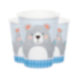 8 papieren bekers in de kleuren grijs, wit en blauw met motieven van schattige beren. Gebruik deze mokken als het tijd is voor een kinderfeestje met beren thema. De bekers zijn ongeveer 10 cm hoog en hebben een inhoud van ongeveer 266 ml.