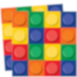 16 servetten met een leuk motief van kleurrijke blokjes. Handig om aan tafel te hebben als je je feestvingers wilt afvegen. De servetten hebben 2 lagen en zijn uitgevouwen 33 x 33 cm.