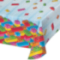 Groot en kleurrijk tafelkleed van papier met afbeeldingen van blokjes. Werkt zowel als decoratie als bescherming tegen het morsen tijdens feesten. Het tafelkleed is ongeveer 137 x 259 cm groot.