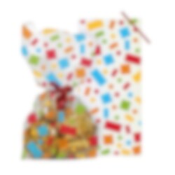 20 uitdeelzakjes in cellofaan met afbeeldingen van kleurrijke blokjes. De zakjes zijn 29 cm hoog.
