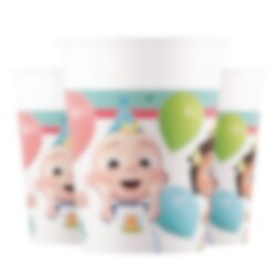 8 papieren bekers met grappige afbeeldingen van Cocomelon-karakters. Perfect voor een leuke tafelschikking op een kinderfeestje met Cocomelon-thema.