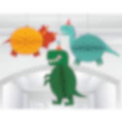 3 stuks hangende decoraties in honeycomb die dinosaurussen in verschillende kleuren voorstellen. Geschikt om op te hangen voor het dinosaurus kinderfeestje. De versieringen zijn ongeveer 16, 28 en 23 cm groot.